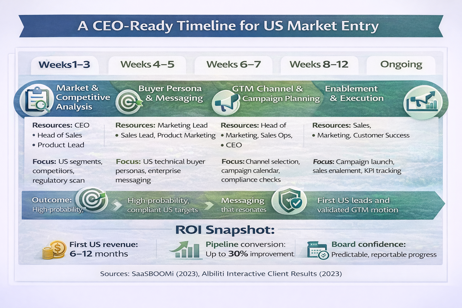 ROI Snapshot: Indian B2B software companies using Aibiliti’s playbook typically achieve first US revenue in 6–12 months, with pipeline conversion rates improving by up to 30% within two quarters (Aibiliti Interactive Client Results, 2023).