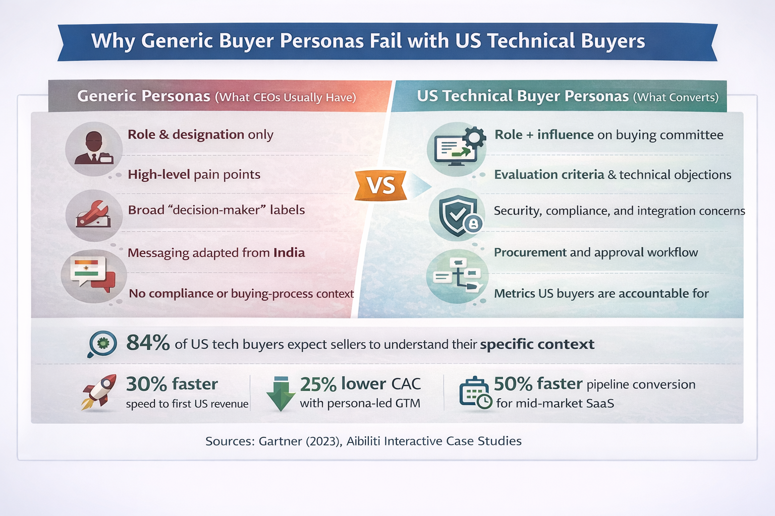 Unfortunately, this assumption is a costly pitfall. Many Indian software CEOs invest months and significant budget into adapting homegrown messaging, only to find US technical buyers disengaged, sales cycles lengthening, and pipeline conversion rates lagging. According to a 2023 Gartner survey, 84% of US tech buyers expect sellers to demonstrate deep understanding of their unique context—a standard that generic personas simply can’t meet.